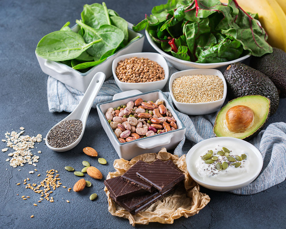 Những thực phẩm giàu Magie: Chocolate đen, bơ, cây họ đậu, hạt hồ đào, hạt lanh, hạt hướng dương, đậu phụ, cá hồi, cá thu, cá bơn, chuối…