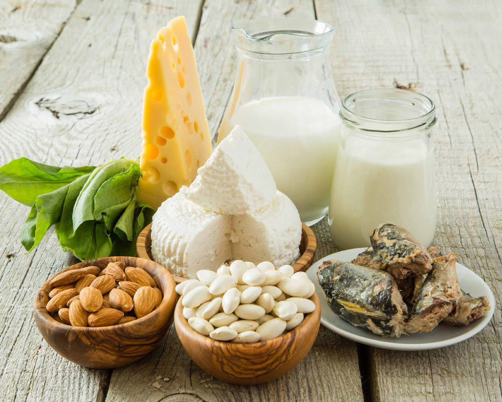Những thực phẩm giàu Canxi: Cá biển, tôm, cua, sò, ốc, ghẹ, hàu, nghêu, rau chân vịt, cải xoăn, bắp cải, súp lơ, cần tây, rau bina, sữa và các chế phẩm từ sữa, các loại đậu, chuối, cam, nho, kiwi…
