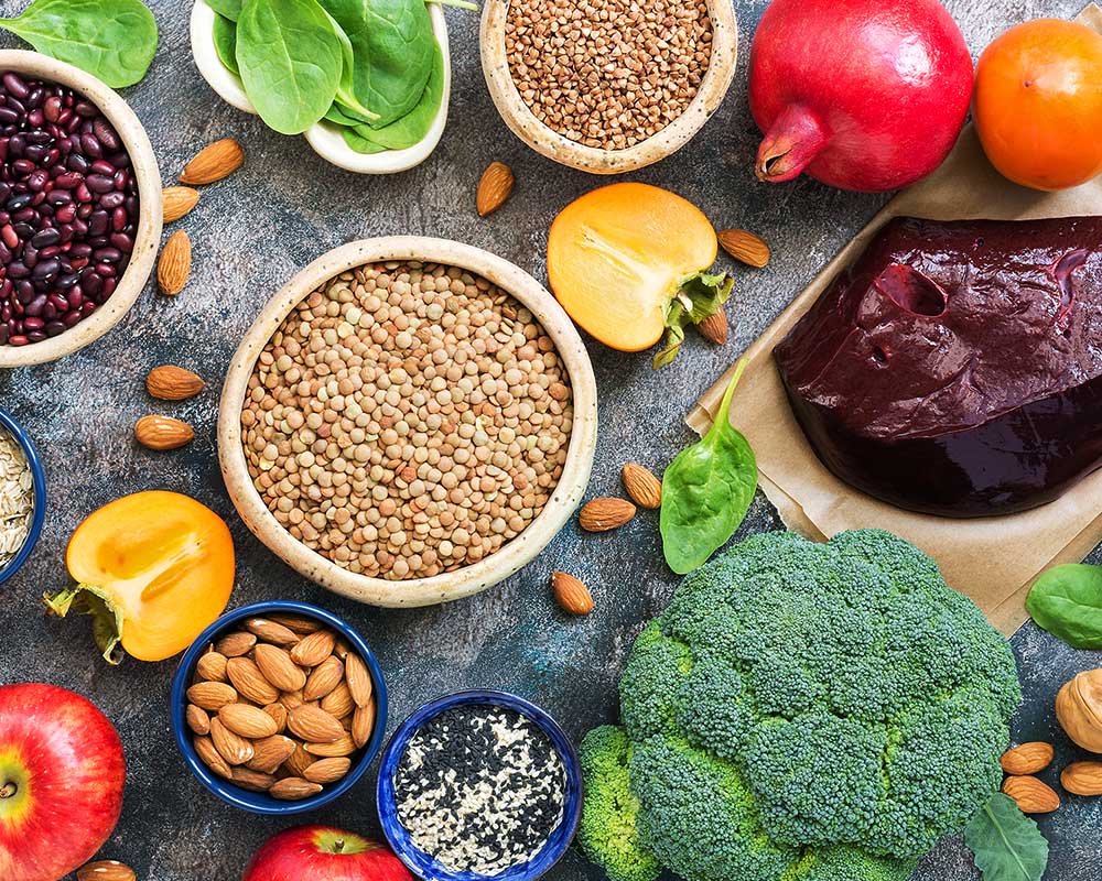 Những thực phẩm giàu sắt: Trứng, gan, tim, thận, thịt bò, thịt heo, thịt gà, thịt vịt, cua biển, tôm, cá thu, cá cơm, cá mồi, hàu, lá lốt, rau ngót, đu đủ, hồng xiêm, lê, đậu tương, gạo lứt…